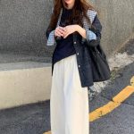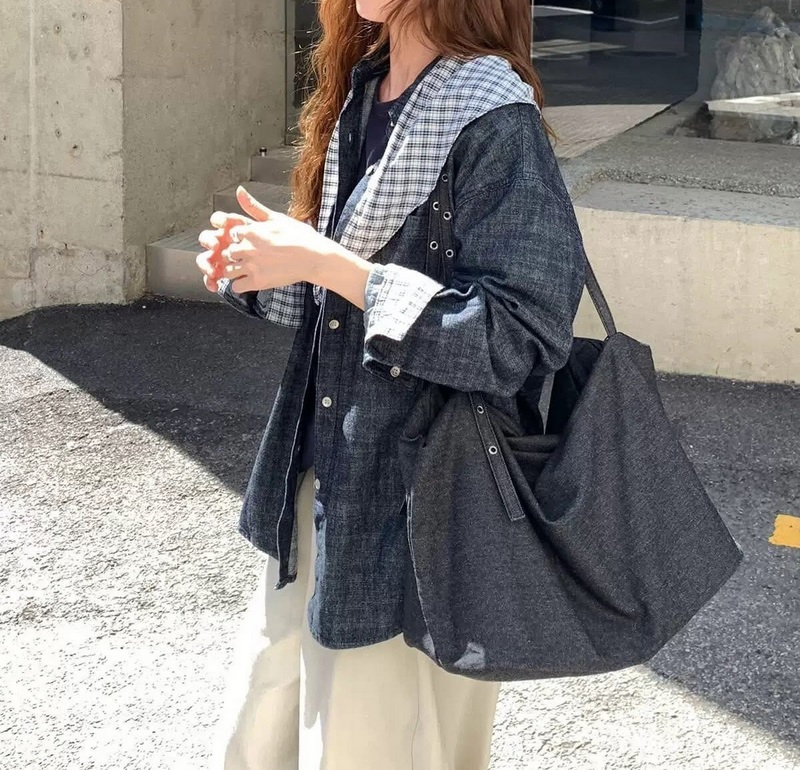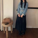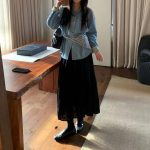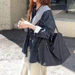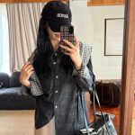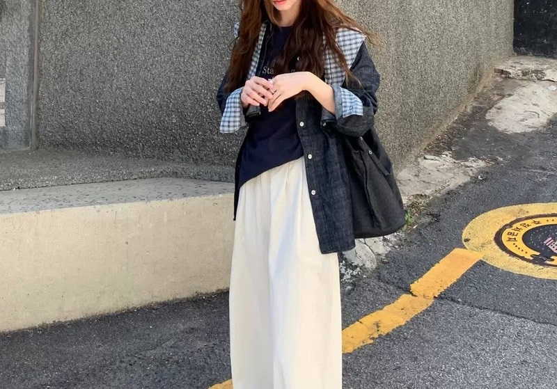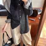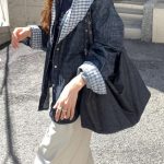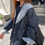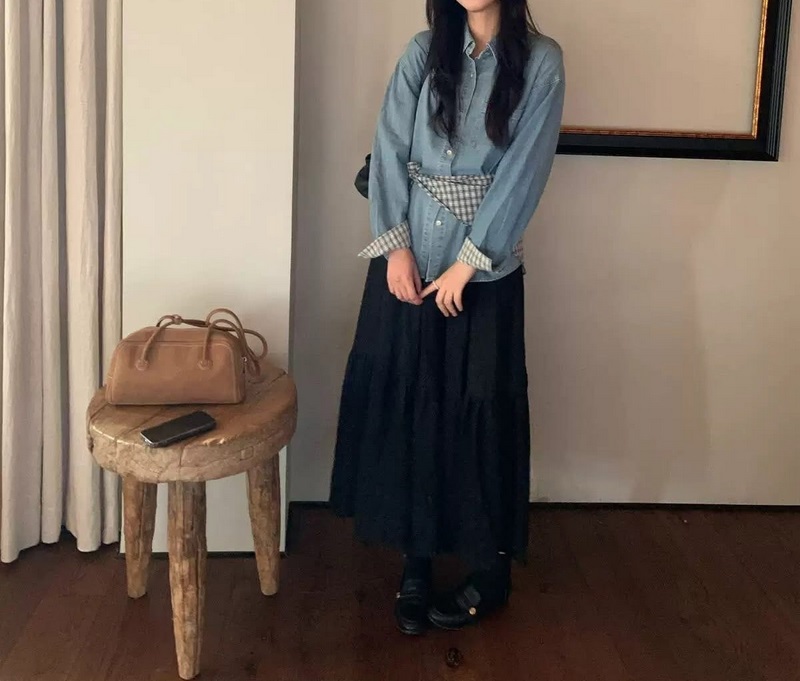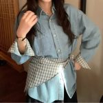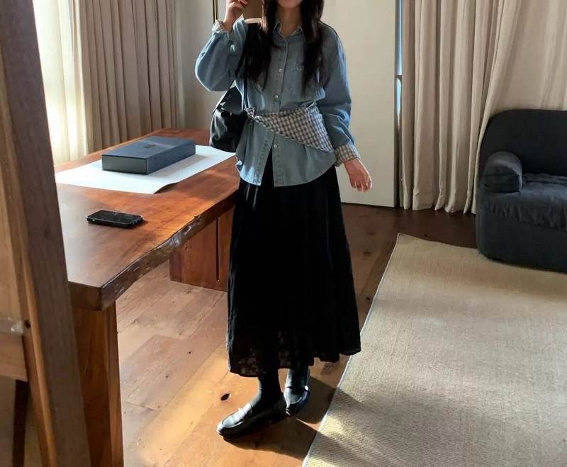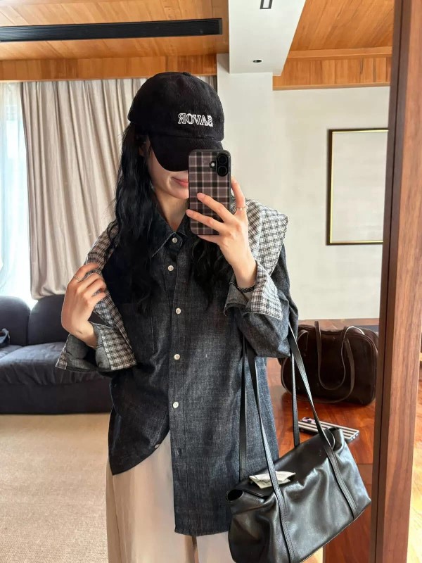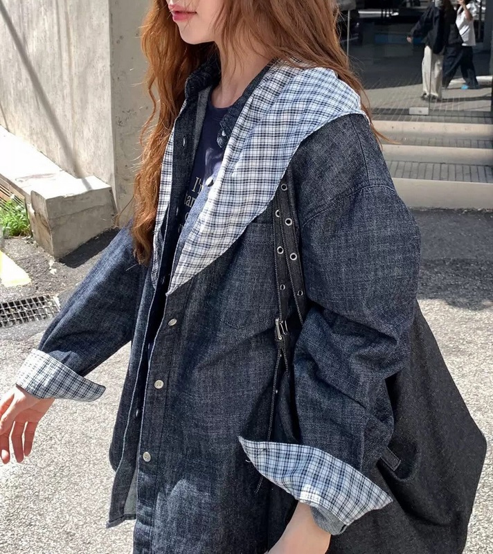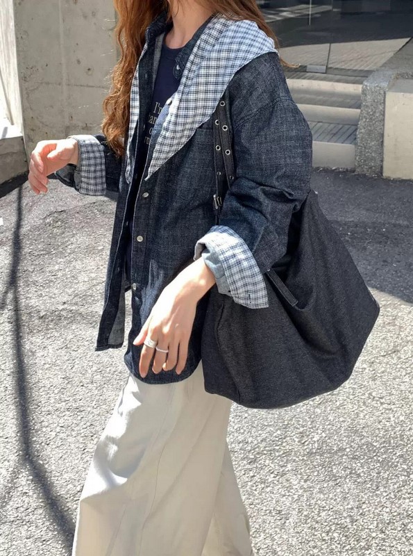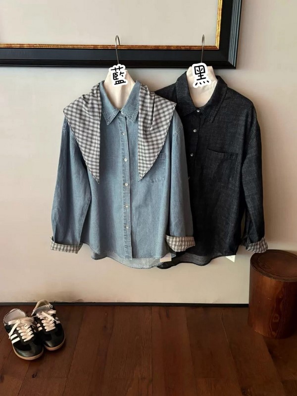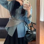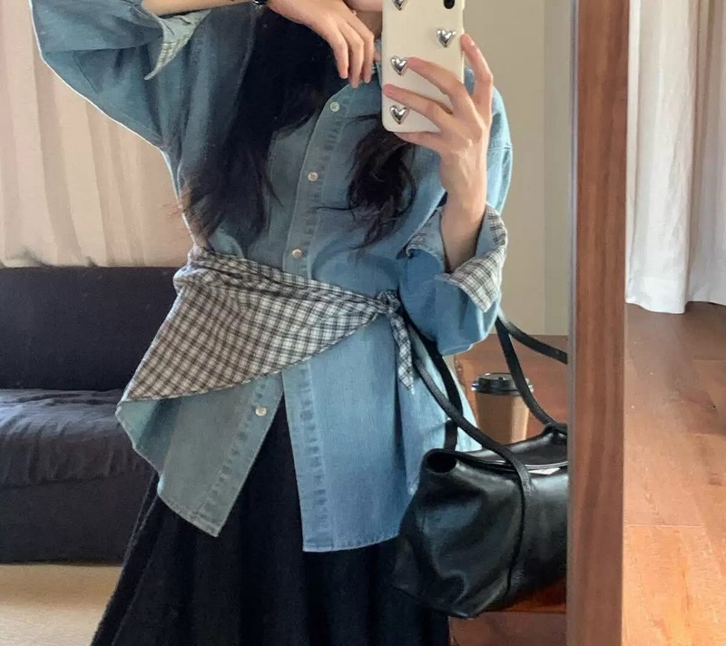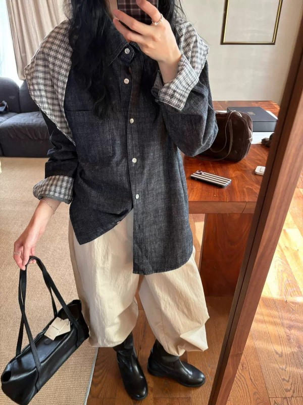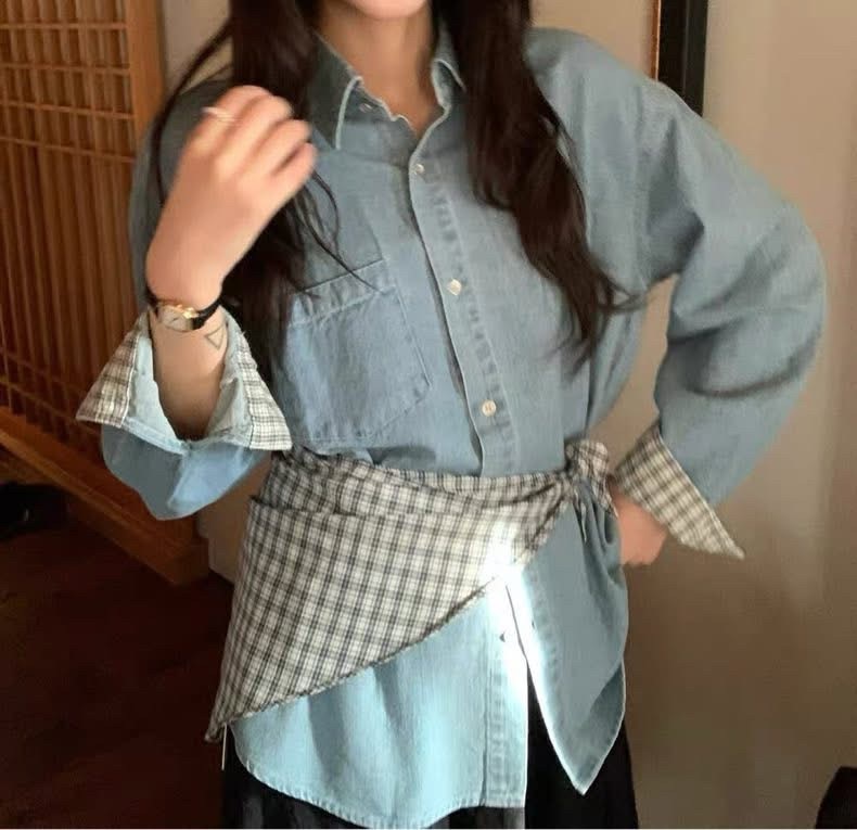 袖格紋設計牛仔襯衫配上格紋絲巾
