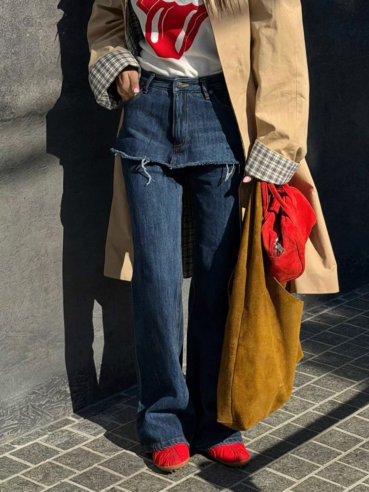 牛仔褲外加小小短裙造型