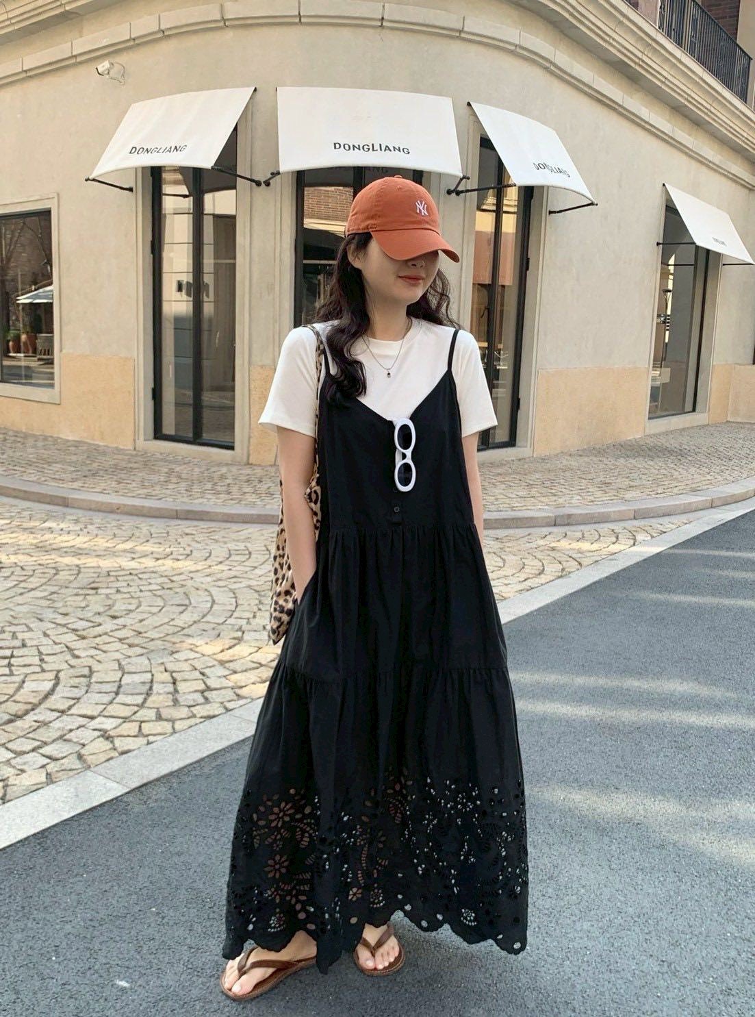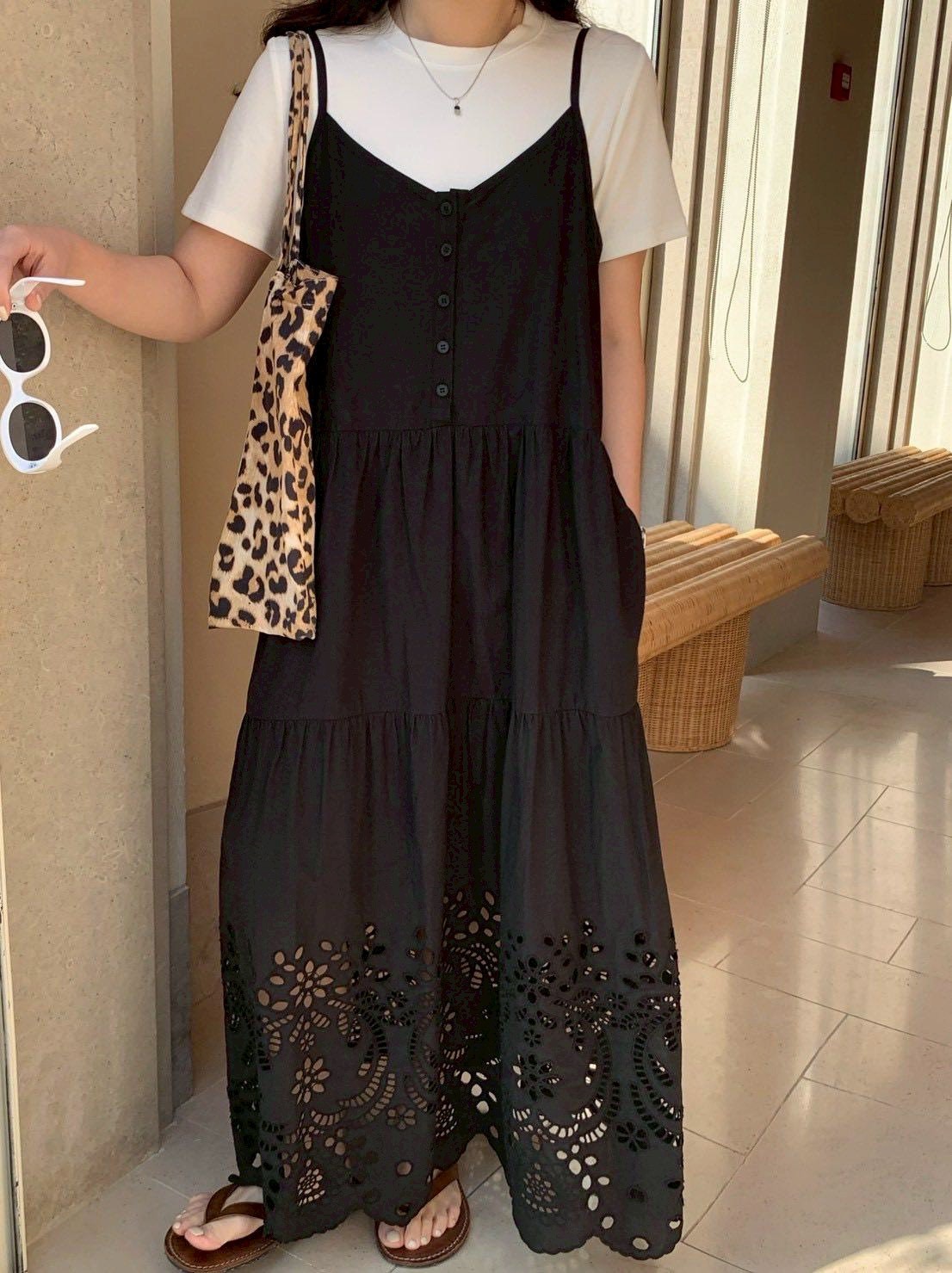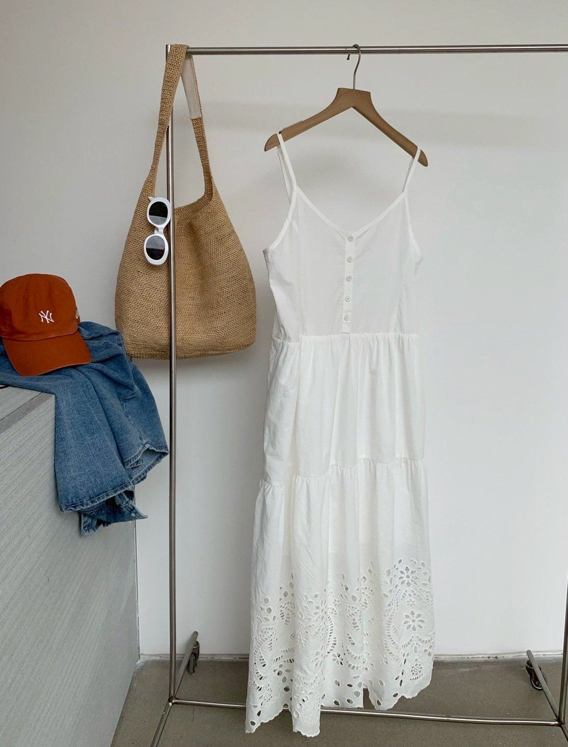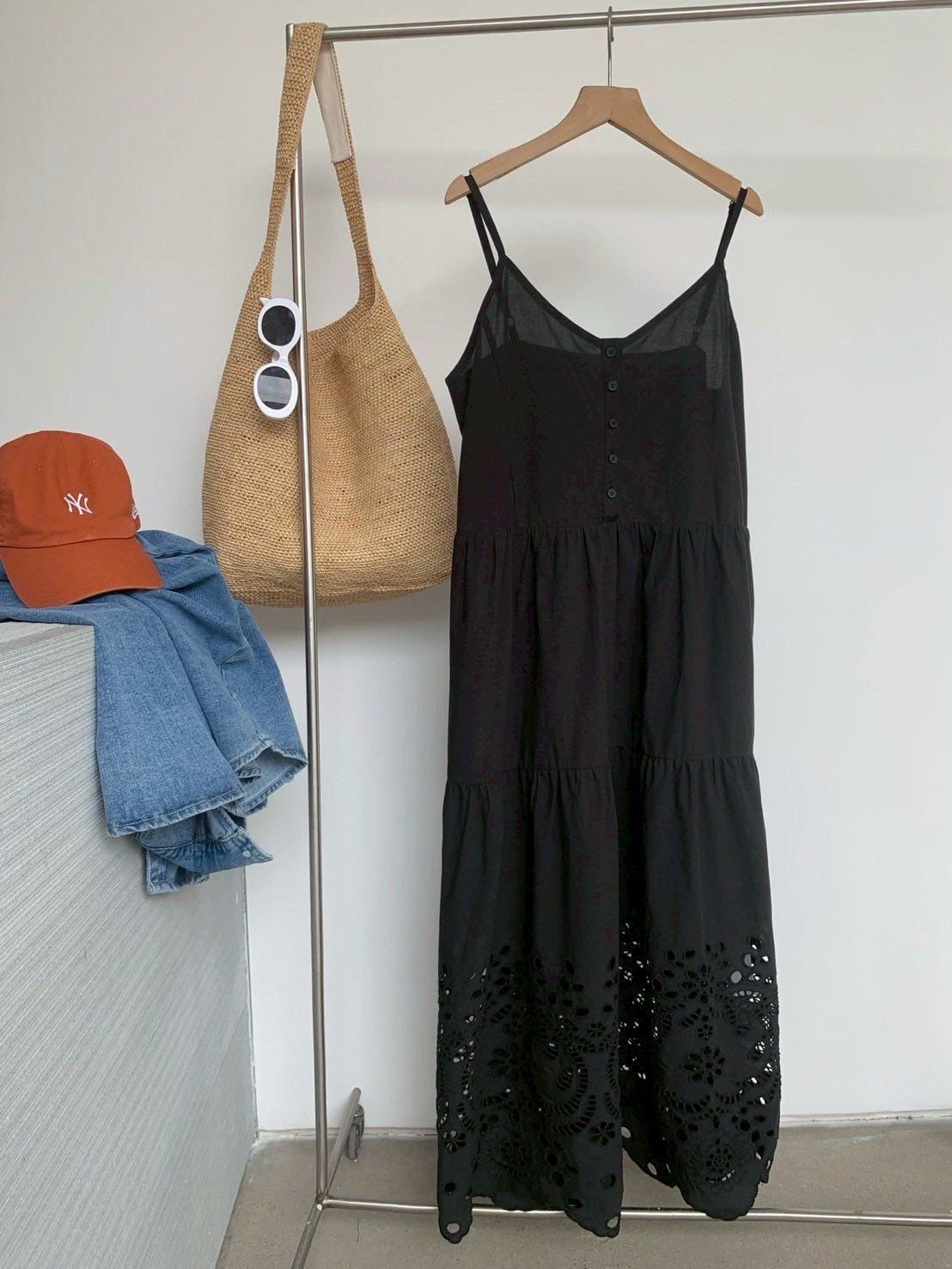 N4250-韓國緹花蕾絲細肩帶長洋裝