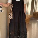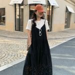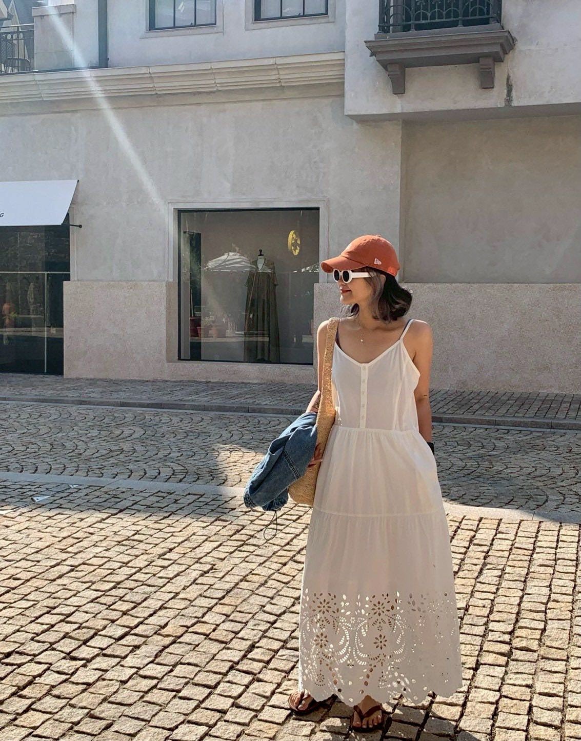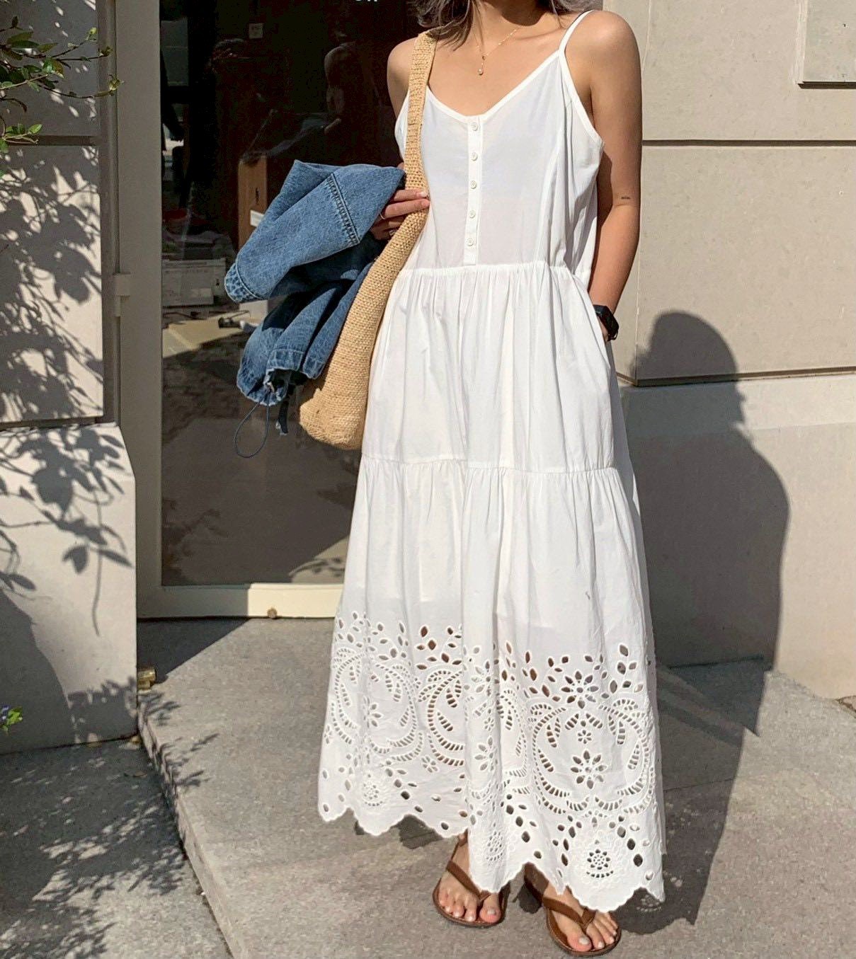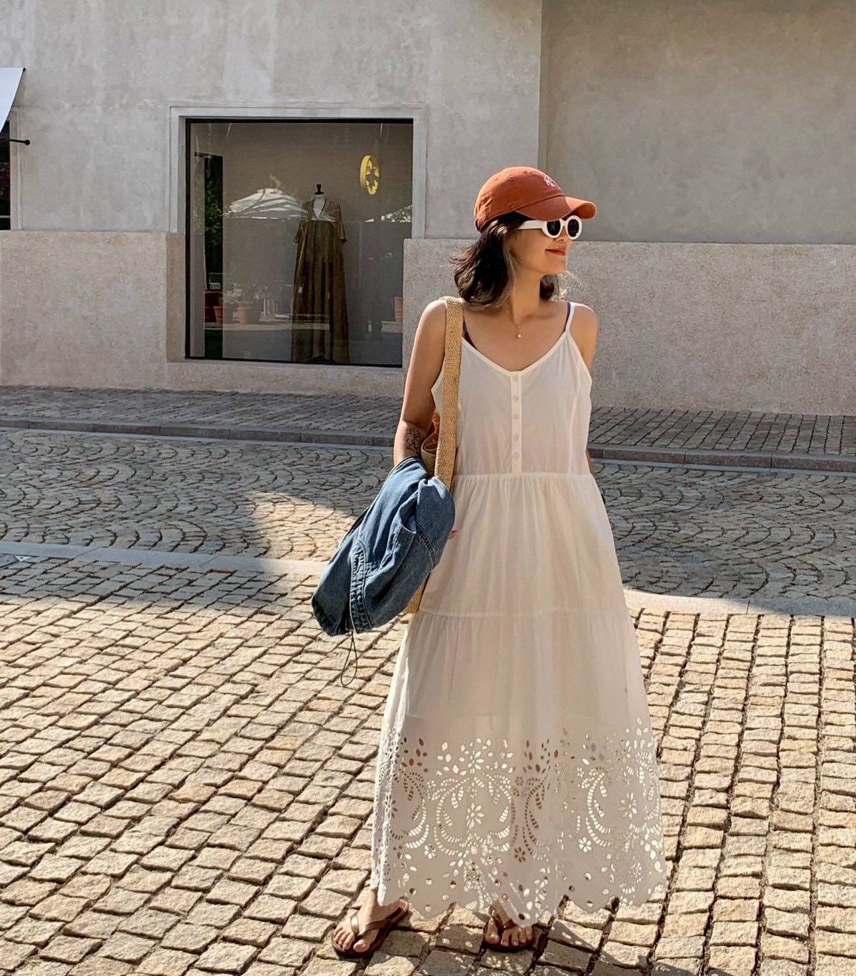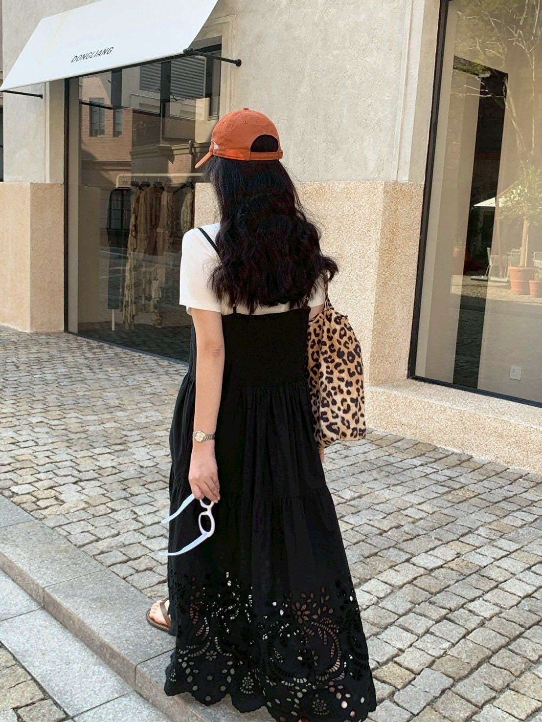 N4250-韓國緹花蕾絲細肩帶長洋裝