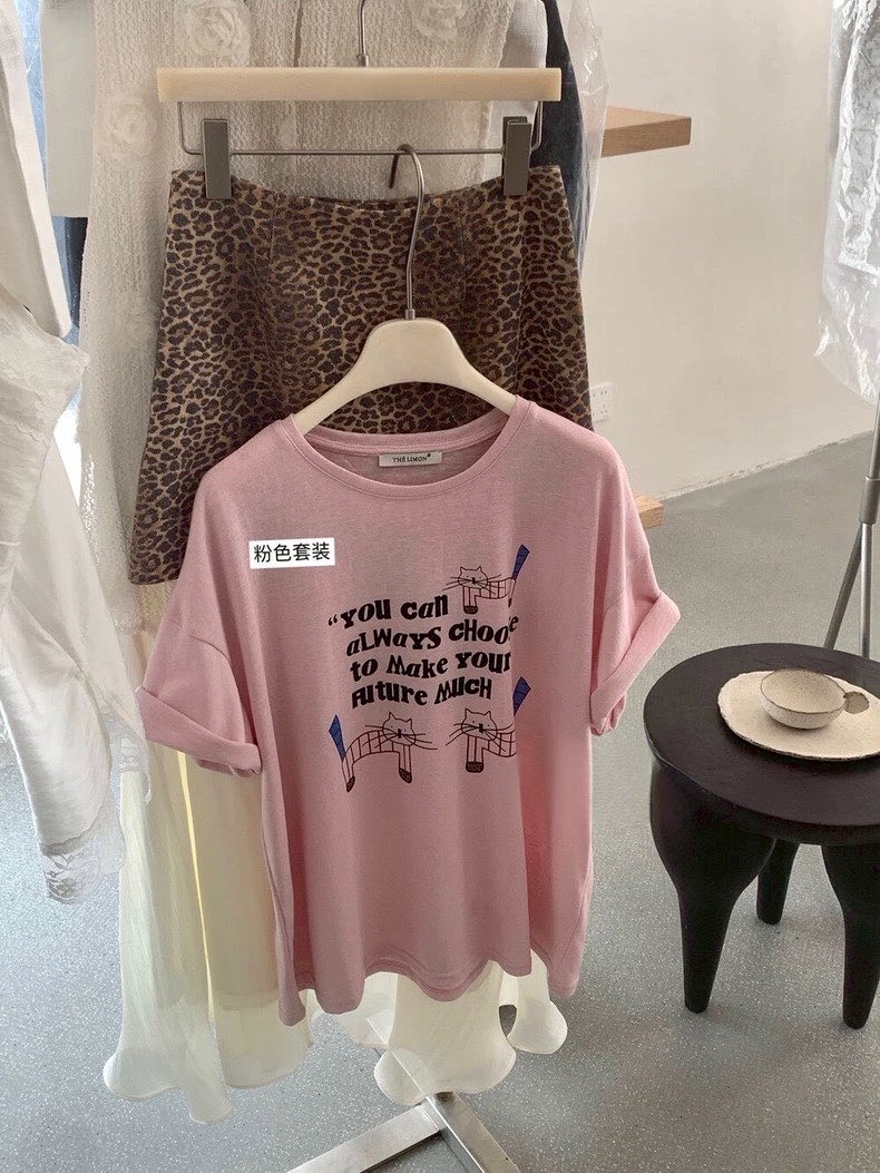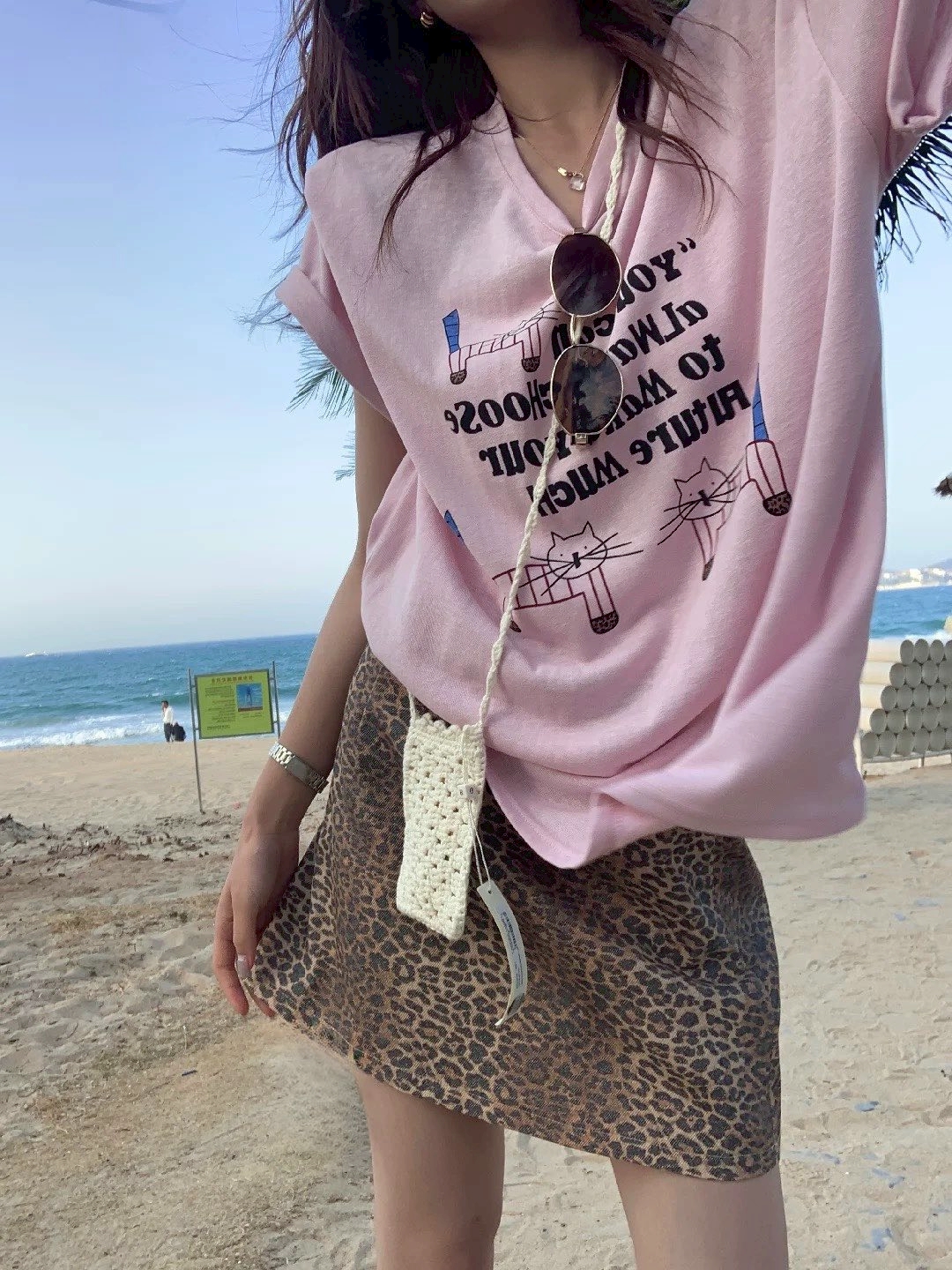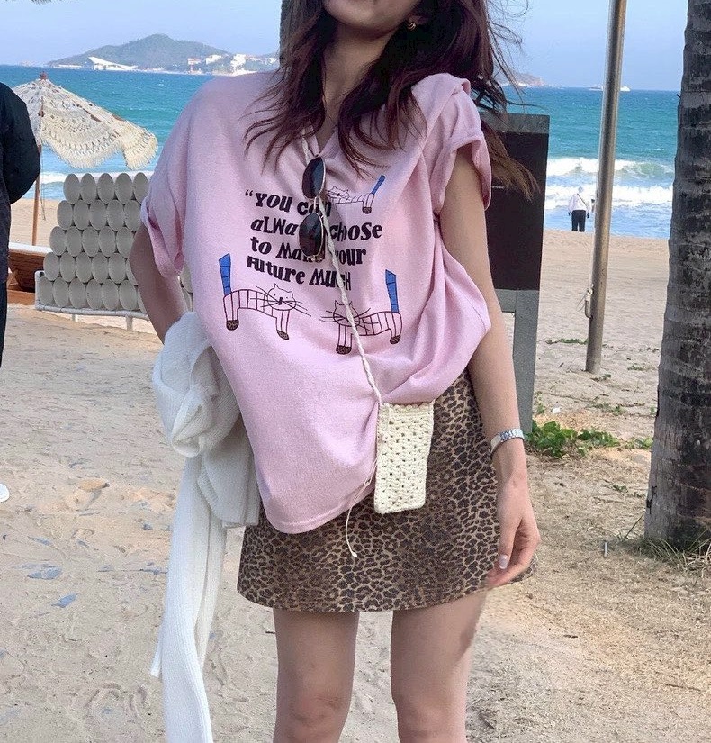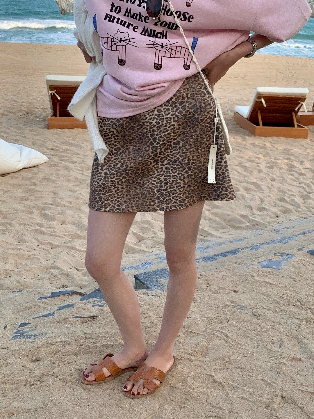 兩件式休閒套裝=粉嫩上衣加豹紋短裙!