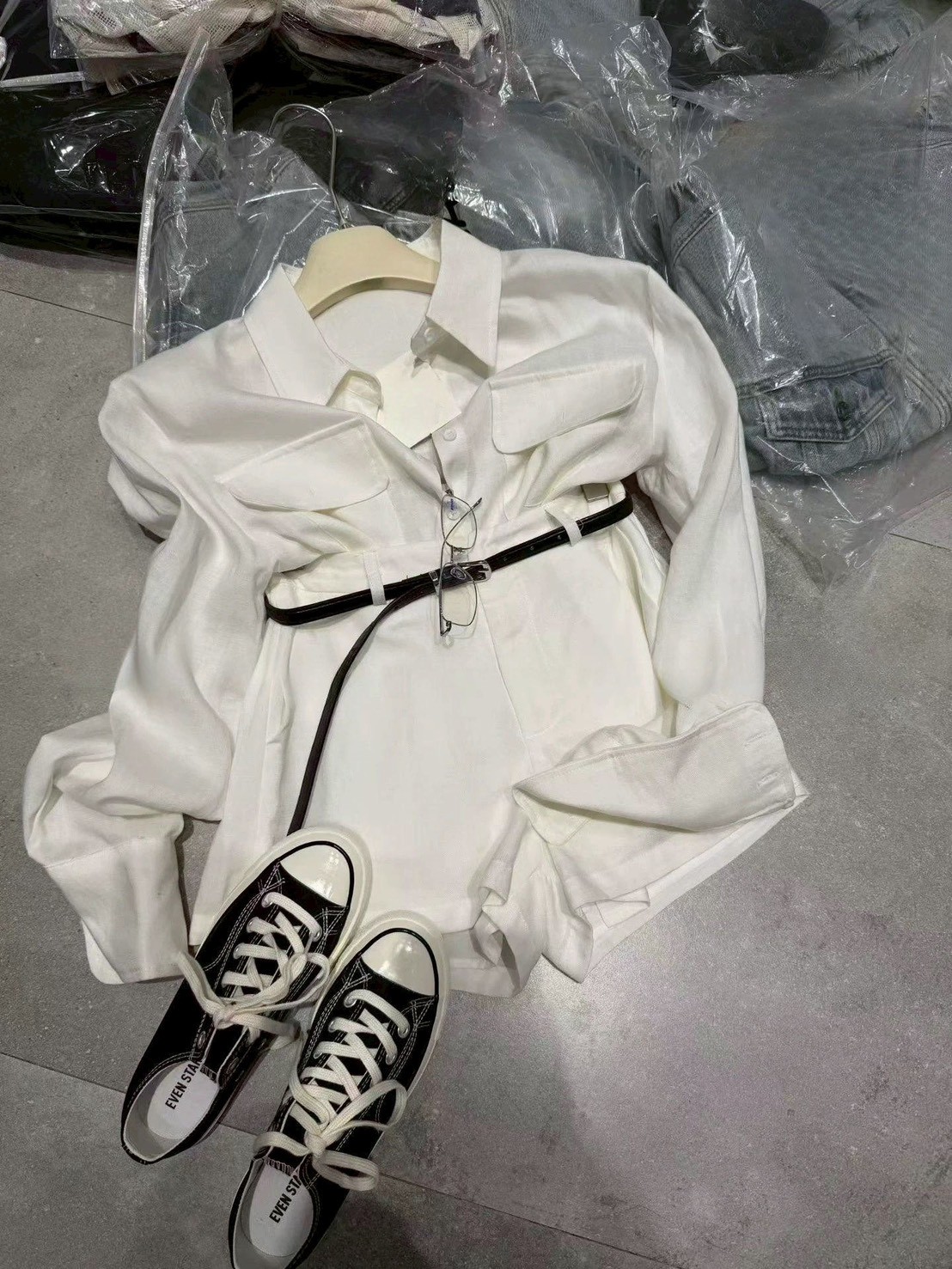 / N4301-質感套裝(雙口袋襯衫+附皮帶短褲 )